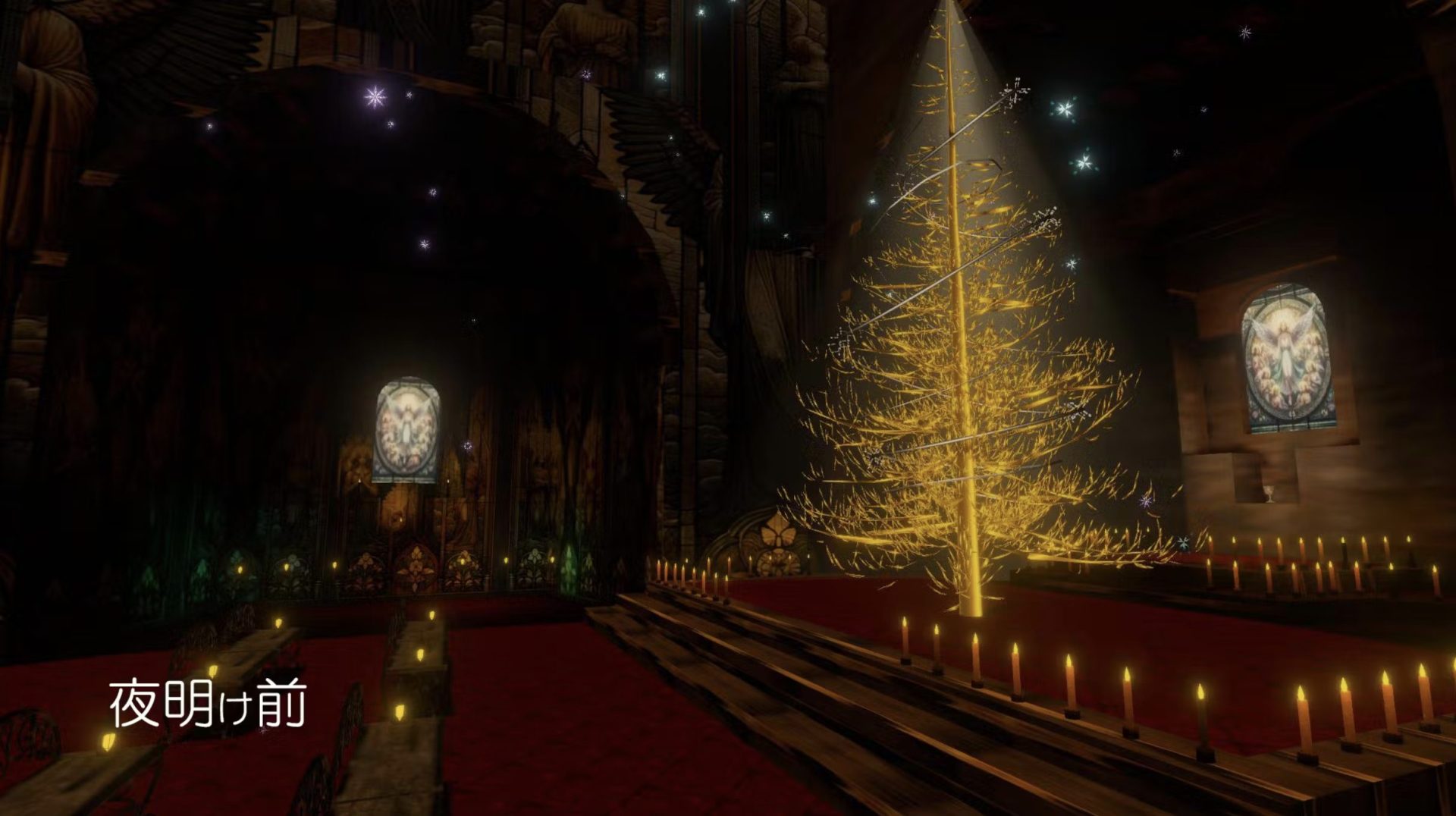 巨大なクリスマスツリーが鎮座し蝋燭が灯る神聖な空間のワールドです。舞い落ちる光の粒子と幻想的なライティングがなされた印象的な世界になっています。