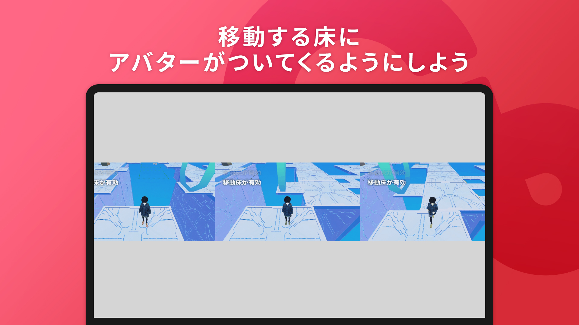 ・回転する床の場合はVRや1人称視点では酔いやすくなってしまうので、注意書きなどで案内したりするのが推奨です。