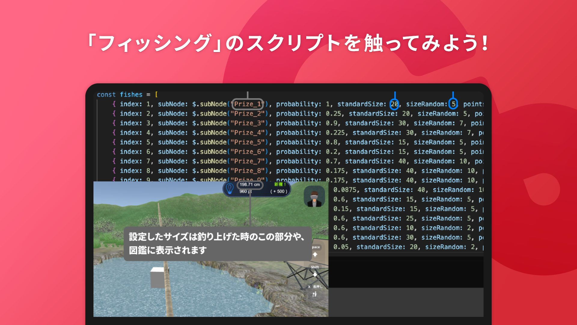 フィッシングでは釣れるものの見た目を変えたりの改変ができます(こちらの記事で解説しています)が、スクリプトを触ることで釣れるまでの時間や釣れるもののサイズ、ポイントを変えることができます。