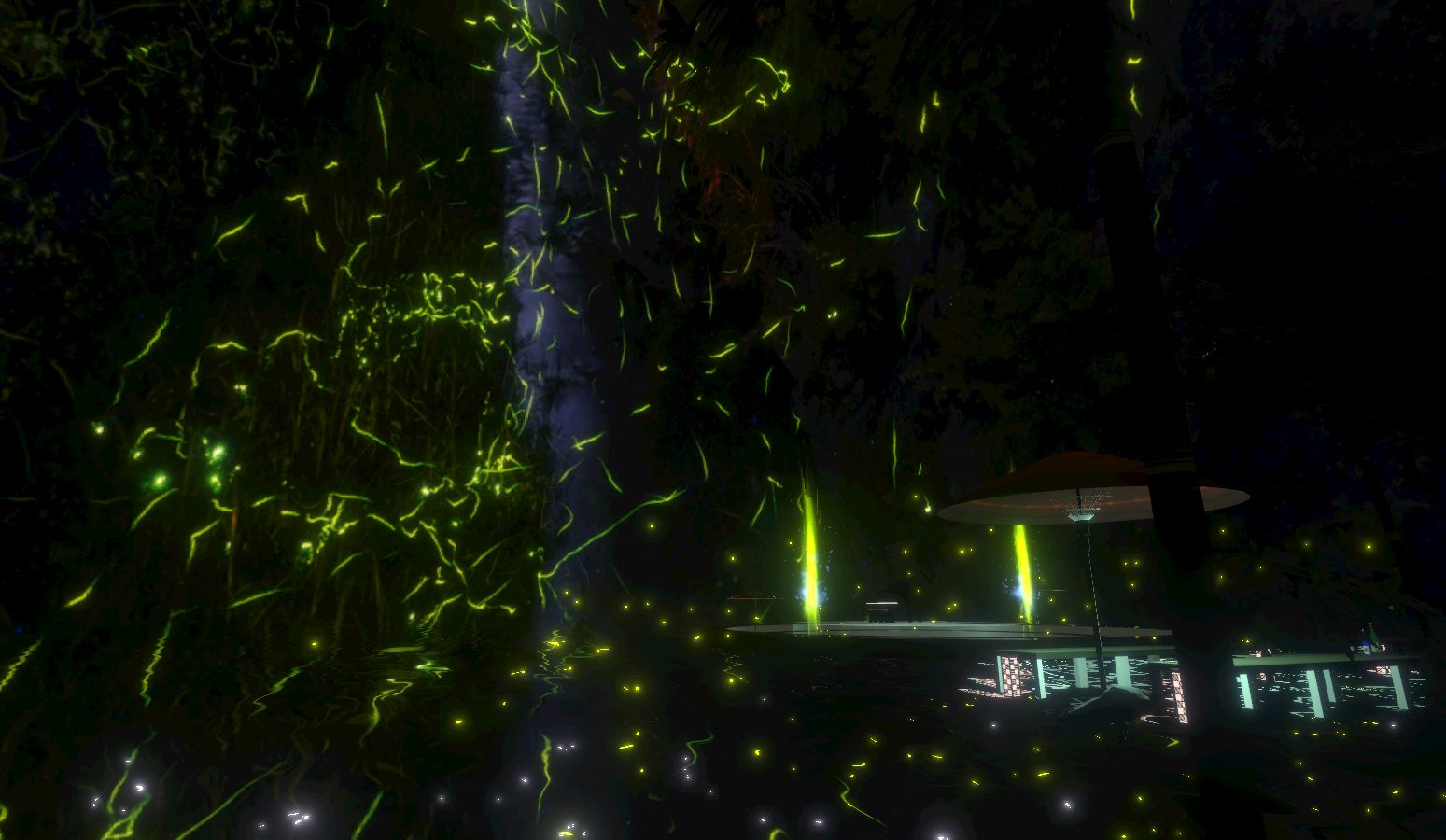 蛍が舞う初夏を感じさせるワールドです。ゆらゆら揺れる水面の上にはピアノステージや休憩所、光の道などさまざまなオブジェクトが配置されています。写真が映えるワールドになっています。