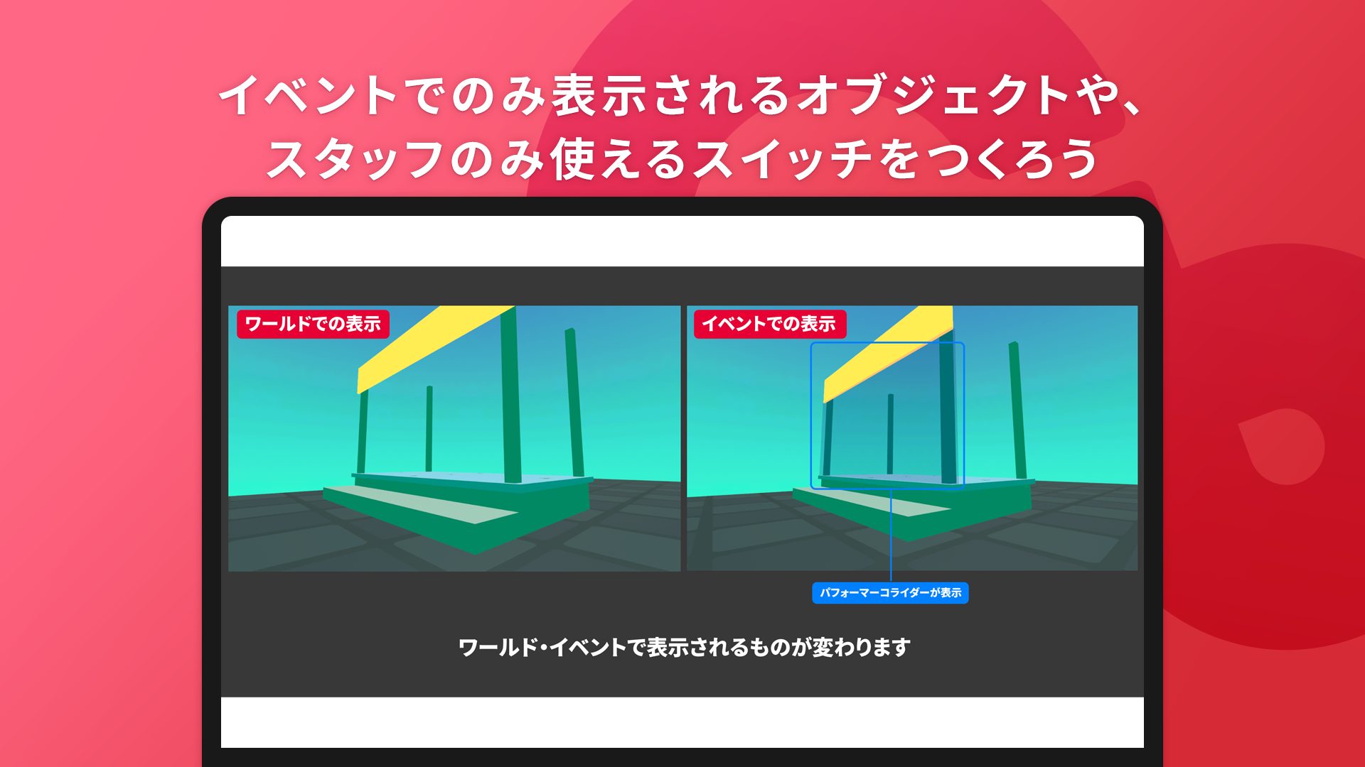 この機能を使って、今回はイベント上でのみ表示されるオブジェクトや、イベントのスタッフからのみ使うことができるスイッチの作成方法をご紹介します。