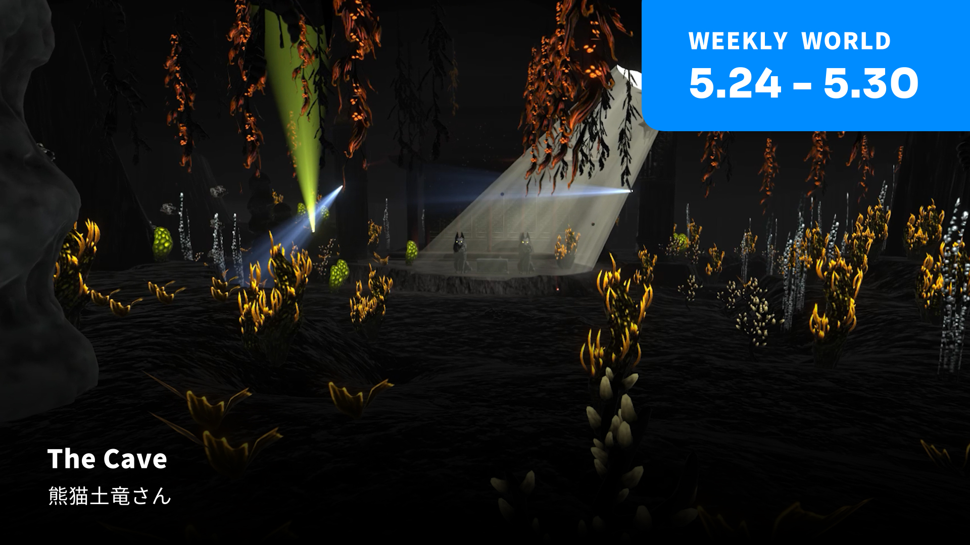 薄暗い洞窟のワールド。最近clusterで使えるようになった「Audio Link」の機能を使って洞窟内部が音楽と連動して演出が走るようになっています。一筋の光が指すステージも用意され、独特の雰囲気の中でイベントができるワールドになっています。探検するのにも面白いワールドです。